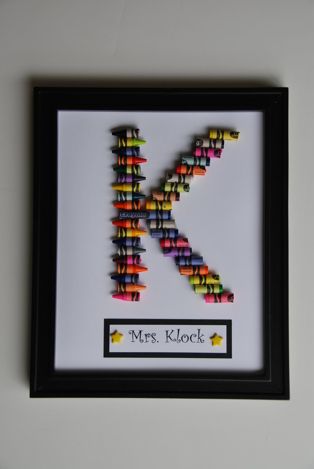 On to Mrs. Klock, Ethan's teacher. Well, I am not sure why, but the letter K was giving me fits. It may just have been that it was 11pm, but I could not get the crayons to cooperate. :( So I came up with this: